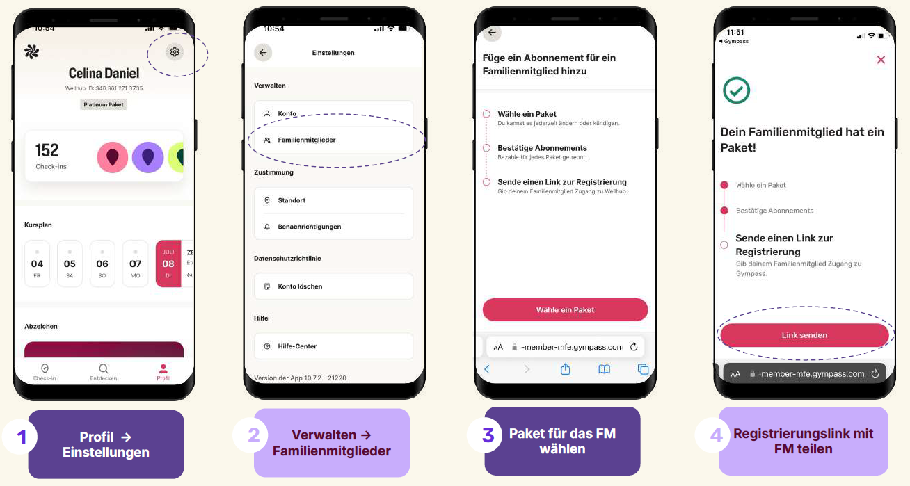 Bis zu 3 Familienmitglieder* können über Sie ihre eigene Wellhub-Mitgliedschaft abschließen.